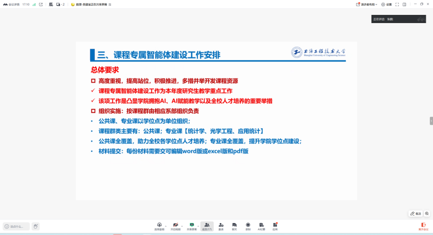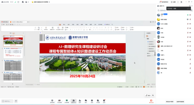 2025年10月24日下午14:00,数理与统计学院在线上召开2025研究生课程知识图谱与智能体建设动员会,吴建宝副院长主持。