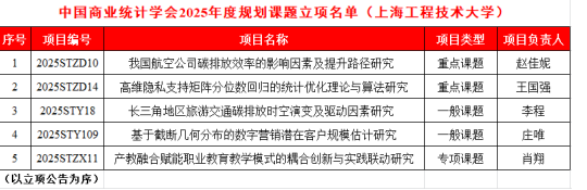 据悉,中国商业统计学会是国家一级学会,其发布的规划课题是我国统计学科领域层次高、权威性强、影响力广的重要科研项目,旨在引导高校聚焦国家战略需求与学术前沿,开展高质量理论研究与应用探索,直接反映高校在统计学领域的研 究实力与学科建设水平,是衡量高校科研竞争力的重要指标之一。