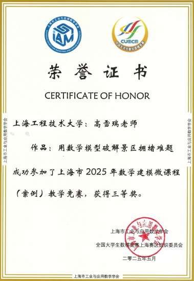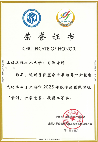 近日,2025年“高教社杯”全国大学生数学建模竞赛上海赛区颁奖大会在上海大学隆重举行,同时颁发2025年上海市数学建模微课程(案例)教学竞赛向奖项。我院教师肖翔、高雪瑞分别荣获二等奖和三等奖。