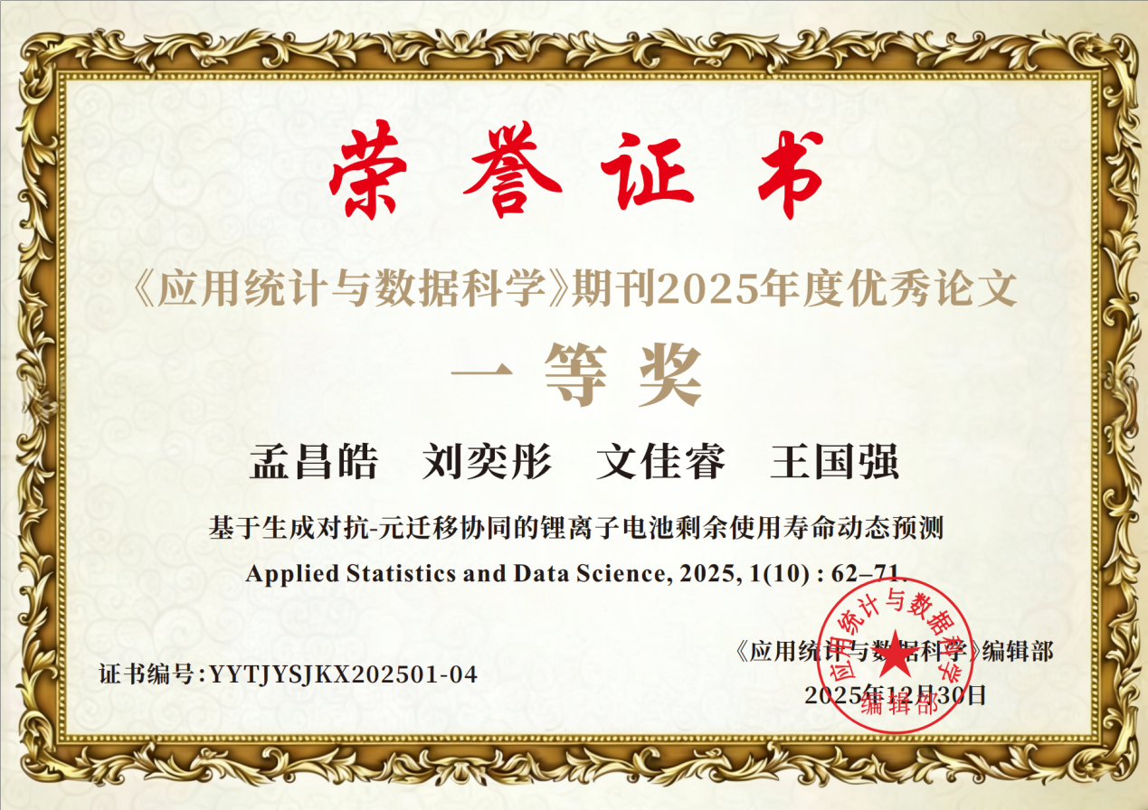 近日,《应用统计与数据科学》编辑部公布2025年度优秀论文评选结果。数理与统计学院数据计算及应用专业本科生孟昌皓作为第一作者,在王国强教授指导下完成的论文《基于生成对抗-元迁移协同的锂离子电池剩余使用寿命动态预测》荣获2025年度优秀论文一等奖。该成果为本年度一等奖中,唯一一篇由本科生担任第一作者的论文。