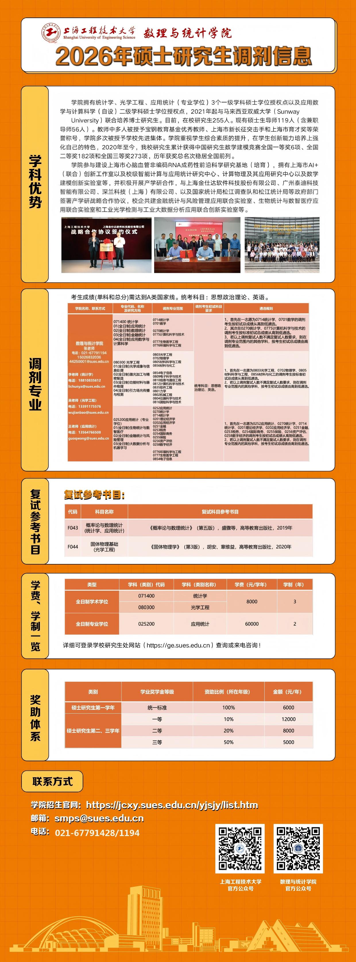 各位同学:欢迎调剂申请上海工程技术大学数理与统计学院!详细调剂通知请查看《上海工程技术大学2026年硕士研究生招生调剂工作办法》