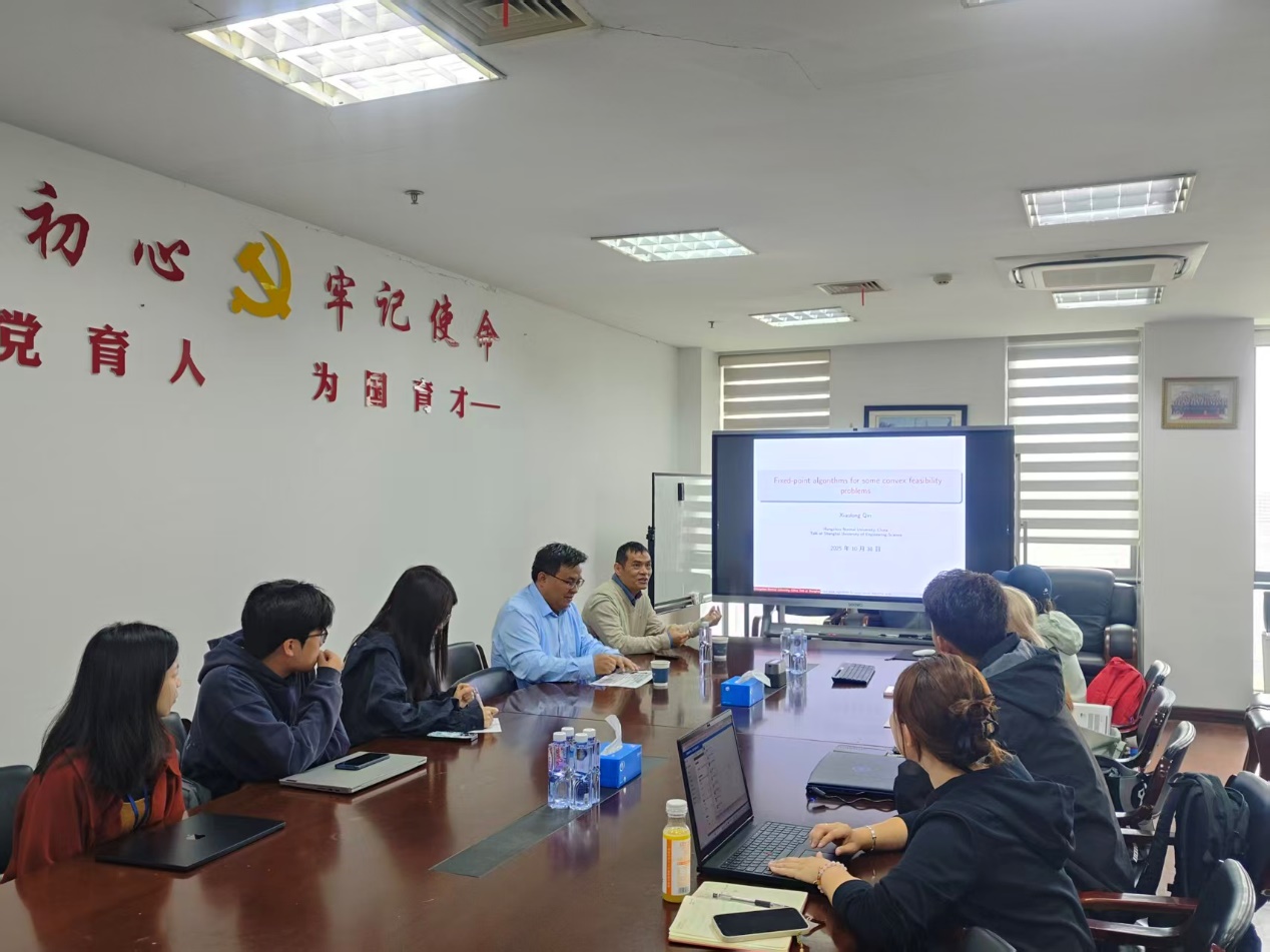为促进学术交流、推动优化理论与应用前沿研究,数理与统计学院于2025年10月30日13:00–14:00在行政楼1308会议室成功举办学术报告会。本次活动由学院院长王国强教授主持,特邀知名学者秦小龙教授作了题为“Fixed-point algorithms for some convex feasibility problems”的专题报告。