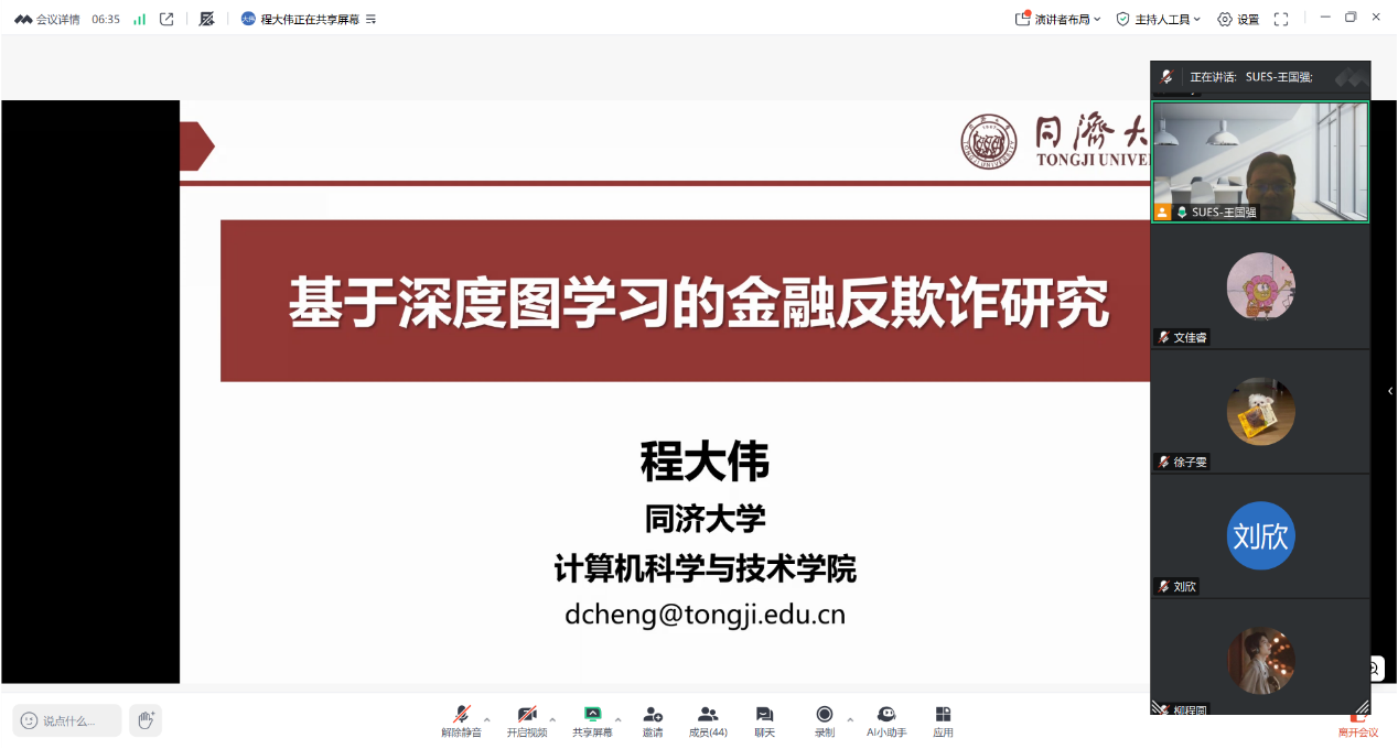 On September 11st, Professor Cheng Dawei from the School of Computer Science and Technology at Tongji University conducted an online lecture via Tencent Meeting. Centered on the theme "Research on Deep Graph Learning-Based Financial Anti-Fraud Models," he delivered an academic feast for faculty and students, focusing on the intersection of cutting-edge technology and financial security. The lecture was chaired by Professor Wang Guoqiang, Dean of the School of Mathematics, Physics and Statistics.