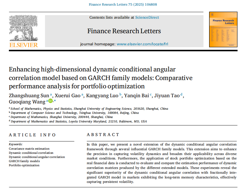 Recently, Prof. Wang Guoqiang from the School of Mathematics, Physics and Statistics guided Sun Zhangshuang, a graduate student of the class of 2022,to publishin Finance Research Letters, a Top journal in the field of finance (SCI journal Zone 2 of the Chinese Academy of Scienceswith an impact factor of 7.4) entitled "Enhancing High-Dimensional Dynamic Conditional Angular Correlation Model Based on GARCH Family," were published in the journal Models: Comparative Performance Analysis for Portfolio Optimization”.